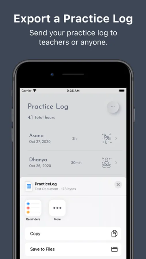 See the total number of hours practiced and export or share your home practice log to whoever you'd like. Export is in CSV that can be opened in Pages, Excel, Google Sheets, and other apps!