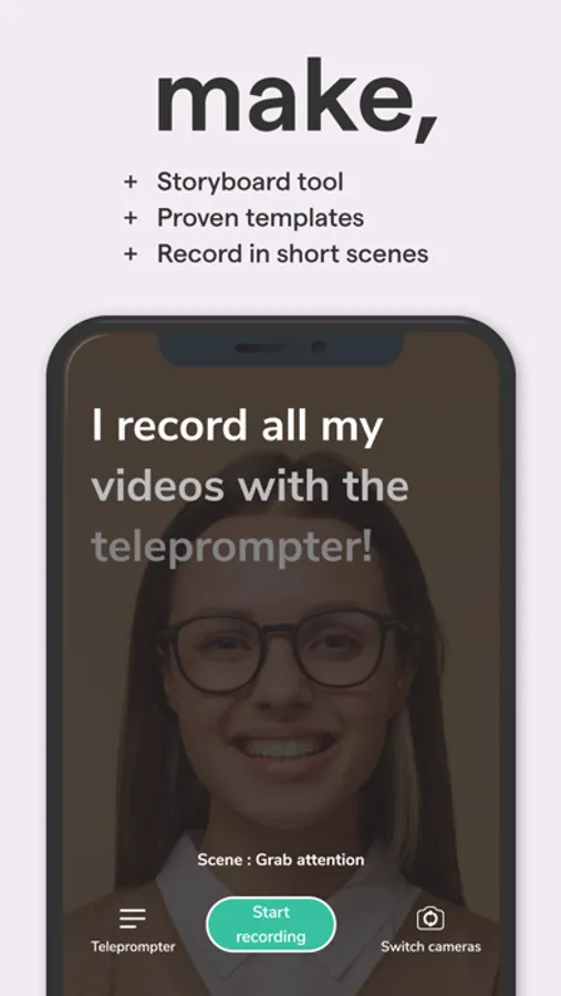 • Teleprompter - Never freeze, record your video with a teleprompter.