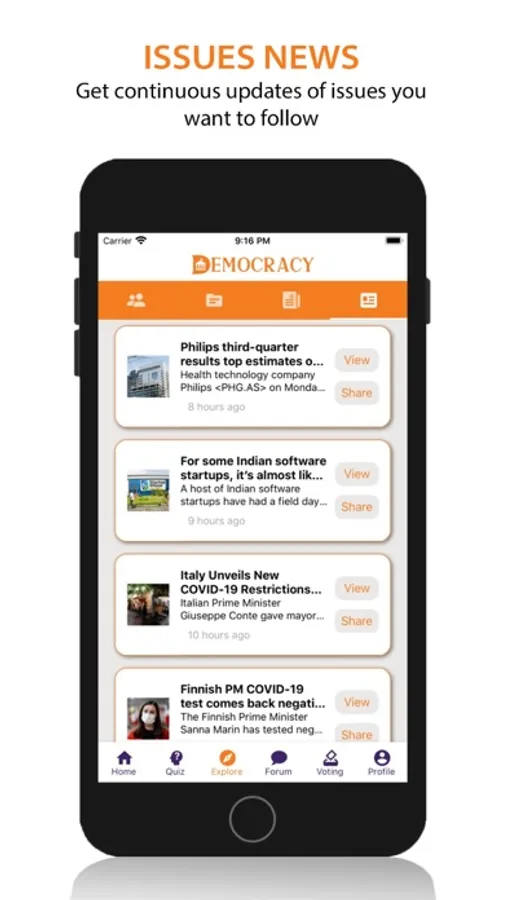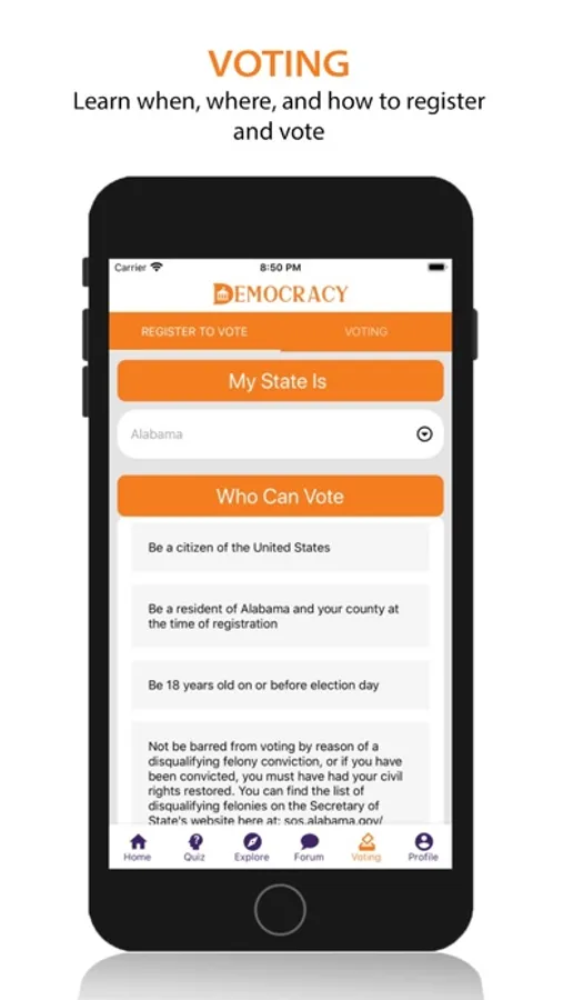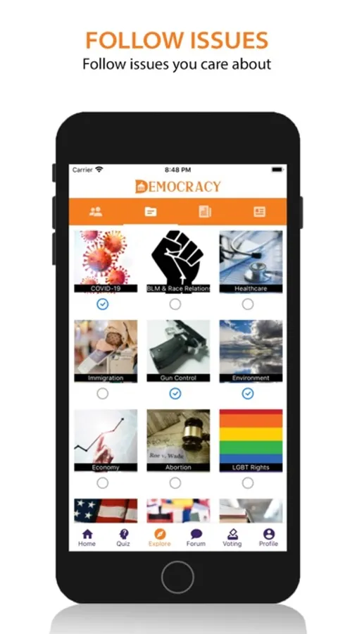 My Democracy app helps you find out all the information you need about the democratic process at your fingertips. Take a quick quiz to find out which presidential candidate you should vote for based on your views. Choose issues and politicians you care about to get constant news updates on them. Learn when, where, and how to vote. Discussion boards to share your views with others.