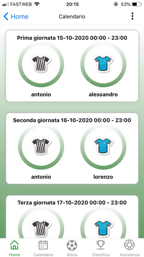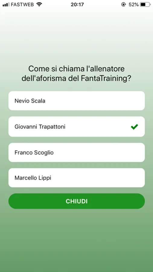 Il metodo FantaTraining ha il suo momento più importante nello svolgimento del Campionato: un torneo a 11 turni. In ogni partita si sfidano due “FantaPlayer”, rispondendo a 11 domande sui contenuti dell’App., consentendo di accumulare punti per la classifica.