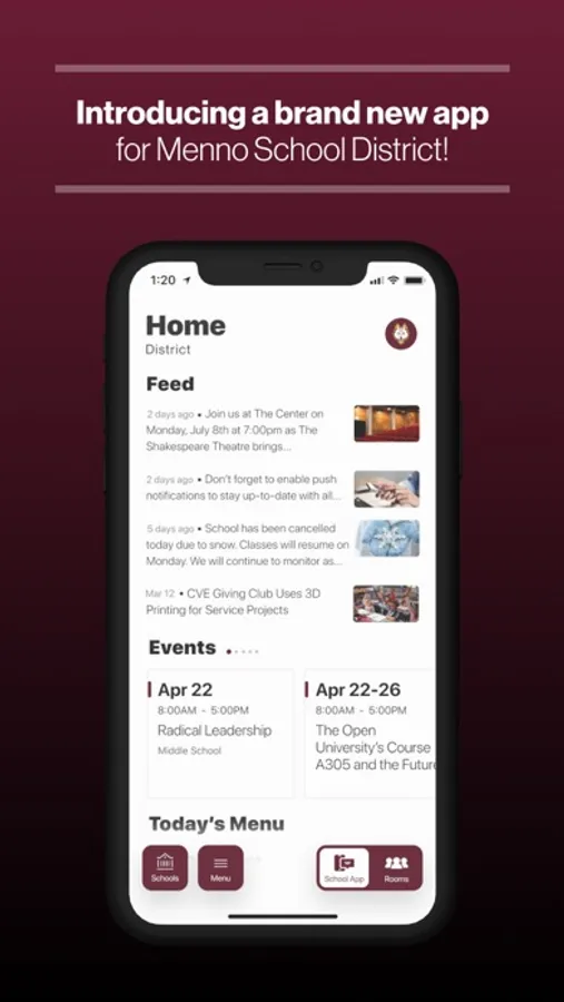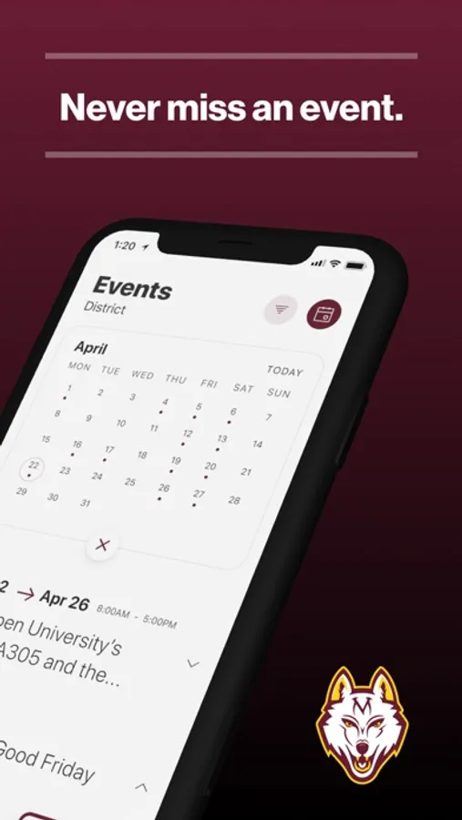 The event section shows a list of events throughout the district. Users can add an event to your calendar to share the event with friends and family with one tap.
