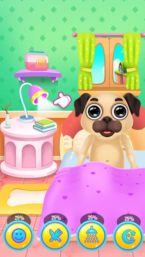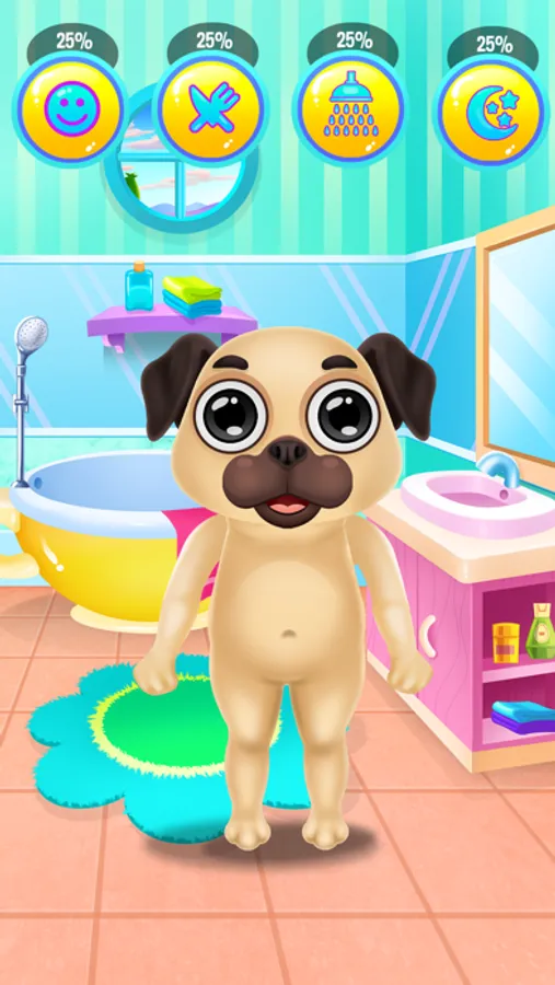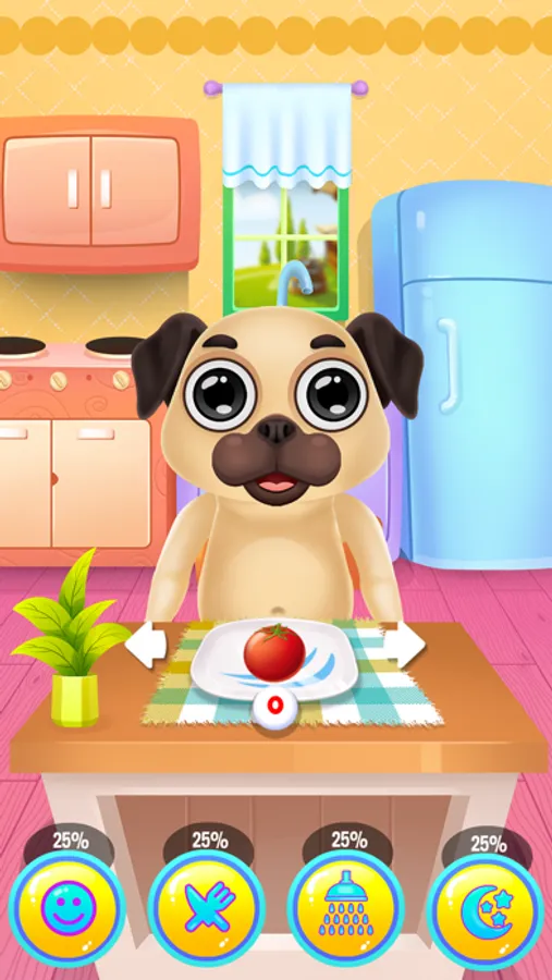 You get to look after an adorable baby Pug that will need your help during the day. Learn his daily routine and complete each task in order to have a successful time as a caretaker for dogs. This puppy game will take you into a great adventure and will teach you everything there is to know when you own a virtual pet. There are some responsibilities that must be fulfilled first then you can have some fun activities. Your animal must take a bath so he could begin his day. Put him in a bathtub and make sure you fill it with water and bubbles. Here you will wash his body and face with proper products. Use the shampoo and the soap to do that. Next comes the teeth brushing where you will make his smile fresh and shiny. Now that you've pampered him you will have to take him to the gym where he will make some interesting exercises. To keep him in good shape you will train with a boxing bag. Once the workout is completed you should take your Pug to the kitchen. Refill his energy with healthy and delicious food. You can also give him a treat. Pick a crazy outfit and let's go to the playroom. Match his accessories with his clothing and ensure a customized look. Play with his toys and have fun outside playing with the ball. After these interactive games, you can play a mini-game with matching vegetables and fruits. Obtain a great score and combine as many fruits and vegetables that are the same. You will know when the time to go to sleep comes because your baby Pug will be so tired. At the end of the day, you will let him rest to recharge his power for another lovely time spend together.