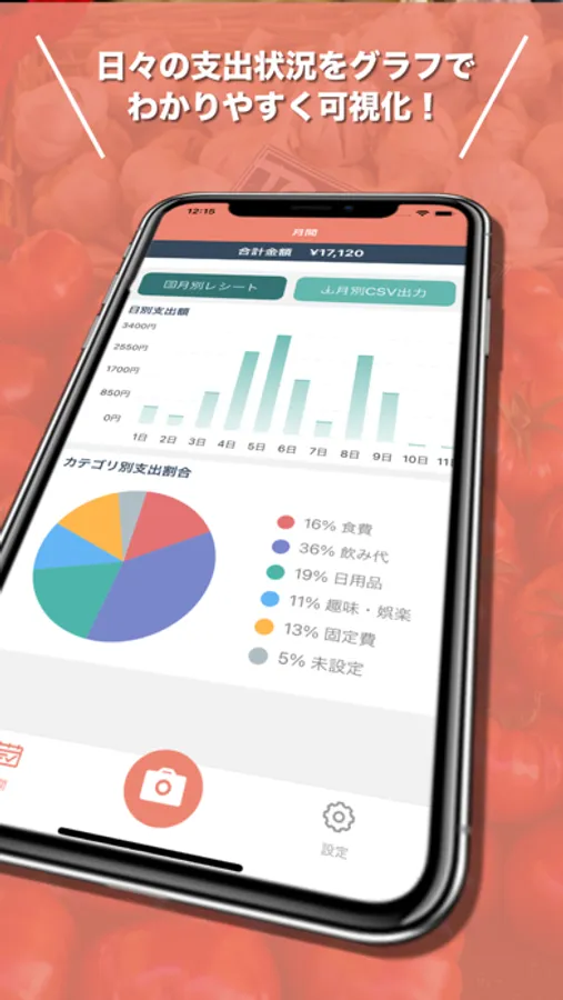 カレンダーとカテゴリ別と日別のグラフで支出状況を一目で把握できます!