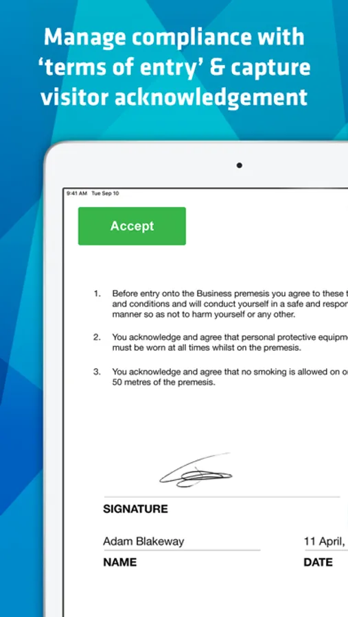 Incorporate Health Screening and streamline OH&S compliance to better manage the safety of visitors and staff. Customise questions into your sign-in workflow and perform different actions depending on the response. Capture visitor acknowledgement and activate compliance workflow management through alerts, terms & conditions of entry, induction policies, documents or videos.
