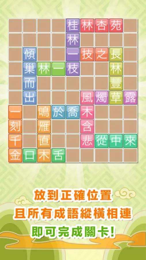 試著移動下方成語,拖曳至上方空格至適當位置,相同字相疊且所有的成語緃橫相連 ,即可完成關卡。
