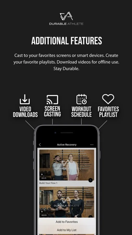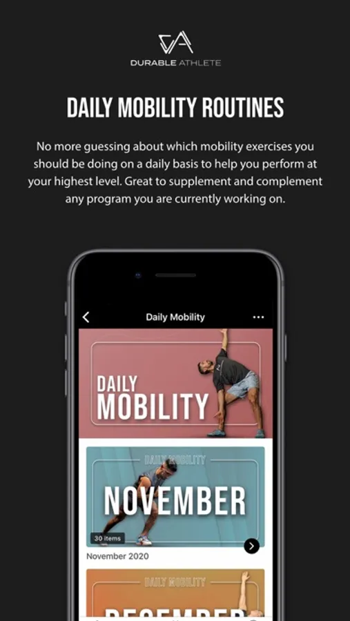 The Durable Athlete app is the ultimate training app designed to empower your fitness and health journey. This app is perfect for anyone who is looking to integrate movement and mobility practice into their everyday routine as well as supplement any preexisting exercise and fitness program you may be currently engaged in.