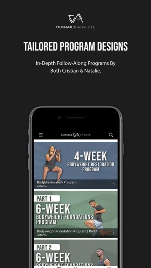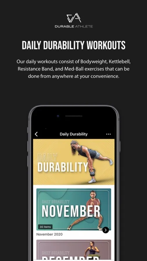These workouts would consist of mainly bodyweight, kettlebell, medicine ball, and resistance band exercises. Also included in the app are lifestyle and nutritional tips to help you optimize your potential. Stay Durable.