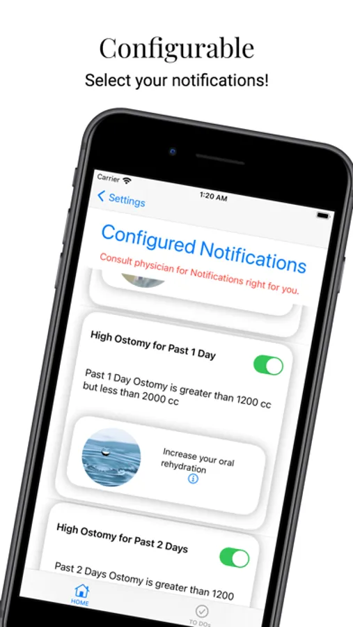 Then, the next morning, you will receive a personalized notification from the app based on your recordings from the prior day. This may include increasing your hydration, taking your prescribed stool thickening medications, and/or seeking immediate medical attention if your recorded outputs are concerning.