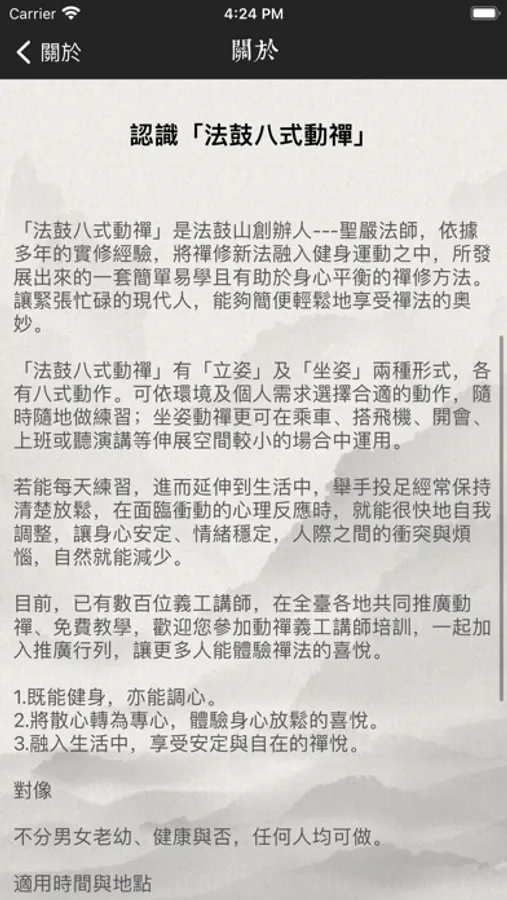 法鼓八式動禪 為了讓緊張忙碌的現代人,能夠簡便地享受禪法的奧妙,法鼓山聖嚴法師依據多年的實修體驗,將禪修心法融入運動中,發展出「法鼓八式動禪」。「法鼓八式動禪」是一套不拘時間、不拘地點,而且簡單易學、有益身心的「動中禪」。只要能勤加練習,在行、住、坐、臥之中,都能以動禪的修行方式,清楚享受身心放鬆的感覺,讓人安定自在。