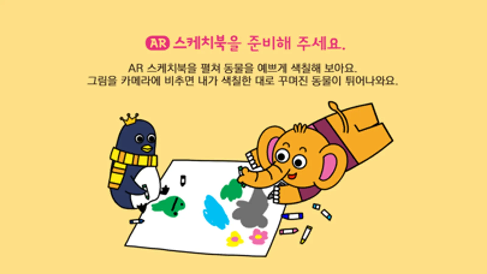 1. 카메라 화면에 〈AR 동물 카드〉, 〈AR 스케치북〉이 벗어나지 않도록 잘 비추어 주세요.