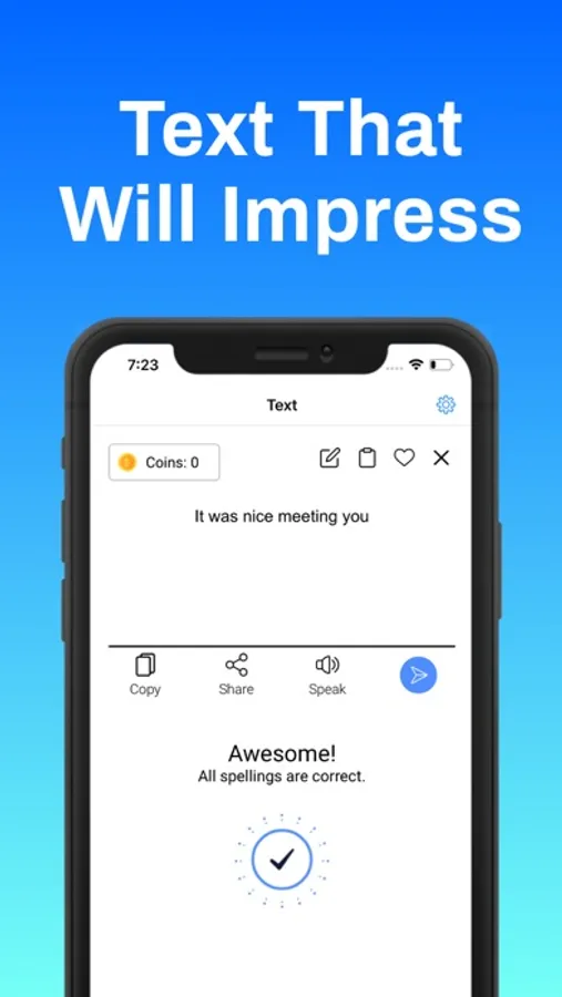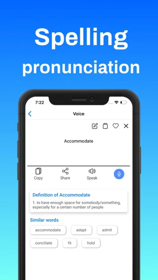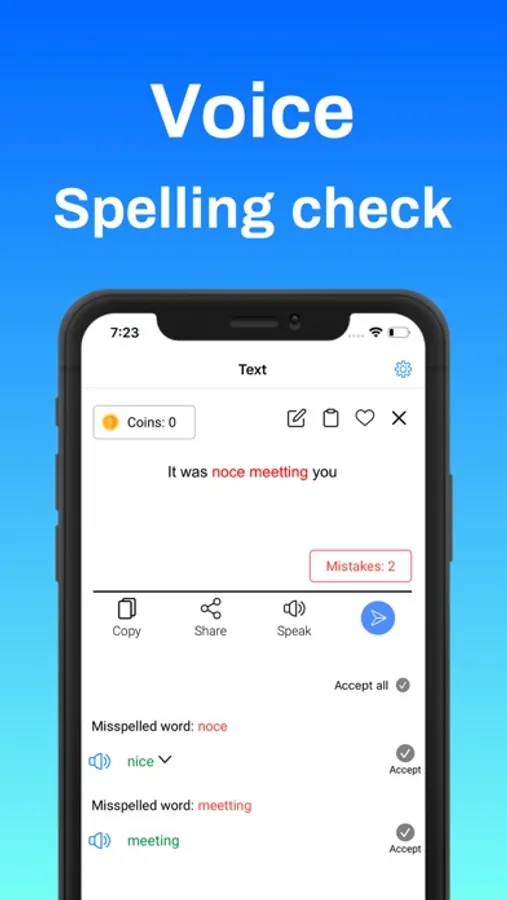 This app helps you finding the correct spelling with speaking and writing. You can use the mic and keyboard to input and share the corrected output via copy or share options.