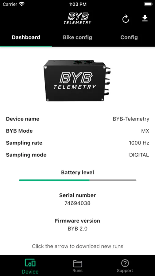 Through this app is possible to manage the settings of the BYB telemetry v2.0 system. It's also possible to download and visualize the acquired data, push them directly to your PC and consult user and software manuals.