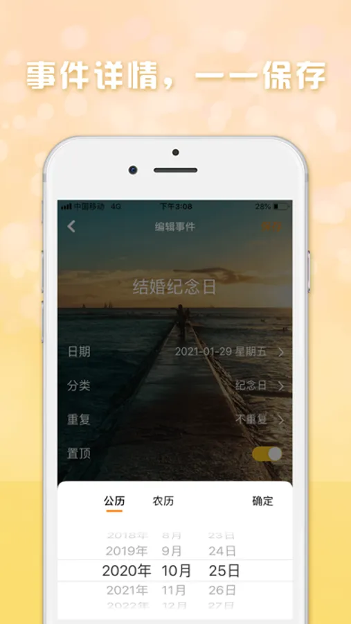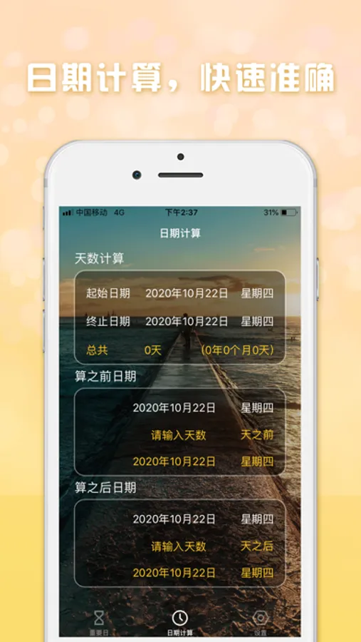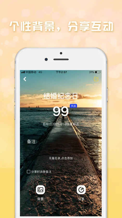 重要日app帮你记录工作生活中各种重要日子。可以记录未来将至的日子并显示剩余天数,好用的是您可以在目标日临近前收到通知提醒。也可以记录已过去的纪念日距今累计天数,一起见证你和TA走过的历程!