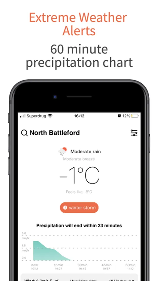 2. Never get caught by rain or snow with the 60 minute chart that indicates any precipitation and it’s intensity in your area;