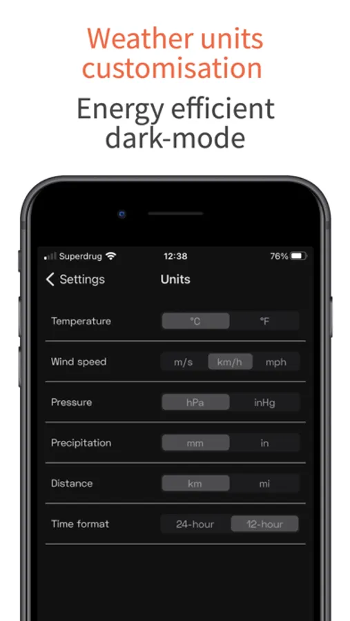 5. Customisation feature for weather measurement units. Construct your own set of preferred measurements for temperature (°C/°F), distance (km/mi), precipitation (mm/in) and more;