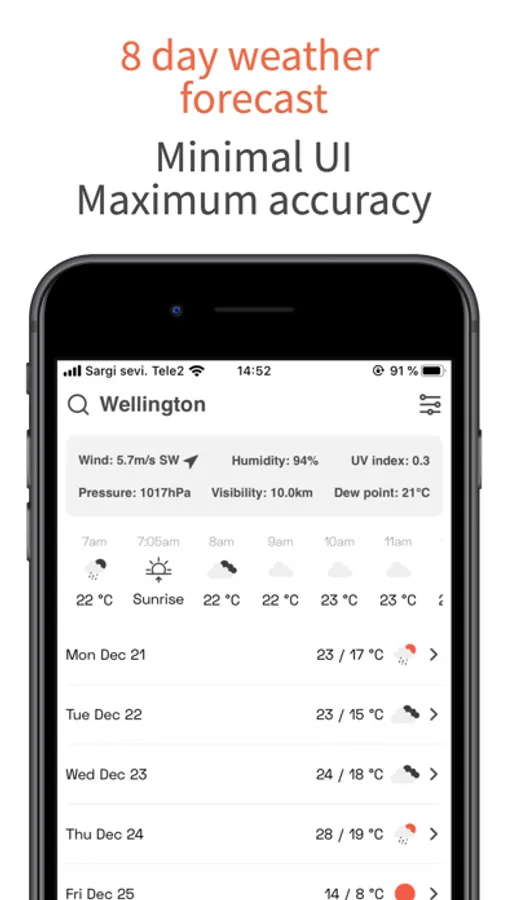 1. Minimalistic design that gives you all the weather information you need including: Feels Like, wind speed; wind direction; atmospheric pressure; humidity; UV index and visibility;