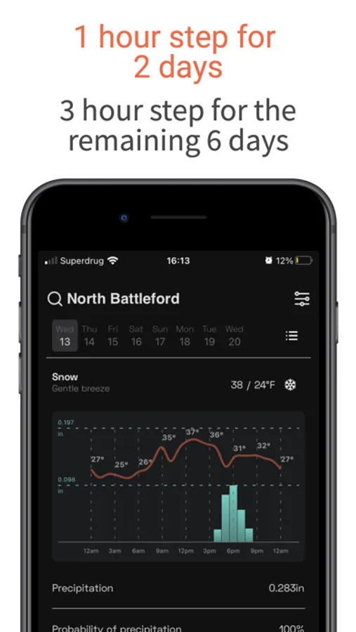 3. Hourly weather chart for the first 2 days and for every 3 hours in the following 6 days;