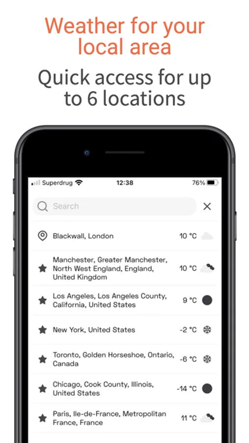 - Add up to 6 cities to your favourites and get the accurate weather forecast for any location;