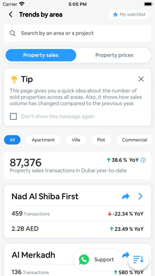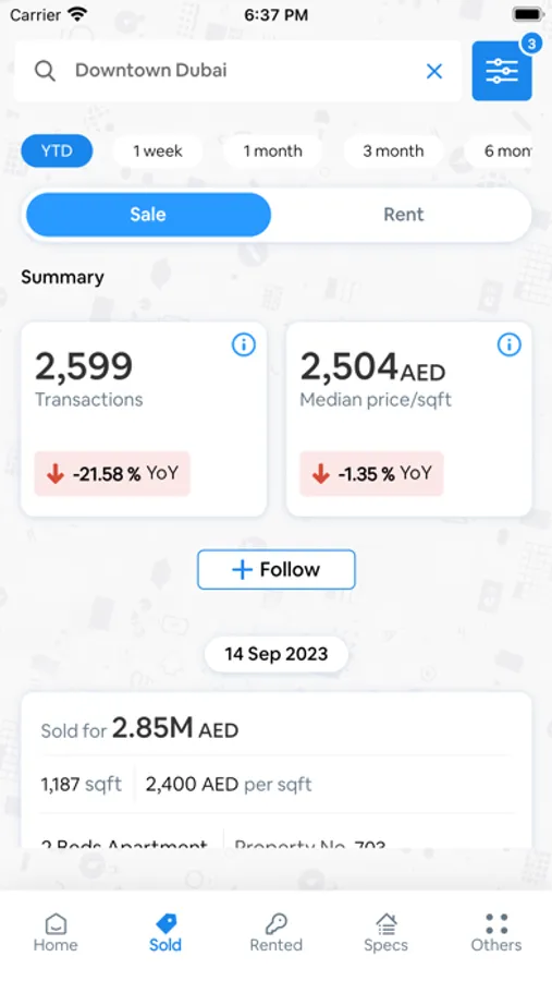 This smart application enables buyers to learn details about every sold property in a project or area. All you have to do is go to Trends by Area and search for the project or area of interest with advanced search filters. It will provide you with all the information about every single sales transaction of your interest such as price per sq.ft, total price, unit size, and the date. It will also show whether the particular transaction was a mortgage or cash transaction. This application will also allow you to share transactions via any medium.