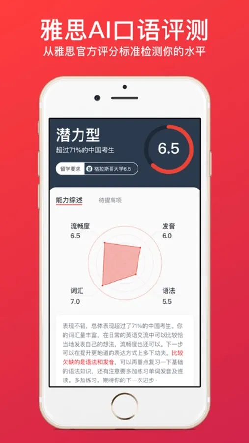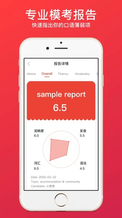 模考完毕后,即可获得专业模考报告,根据模考整体表现进行分析,目前真实雅思水平,下一步提升关键点。可以快速指出你的口语薄弱项,复习效率更高。