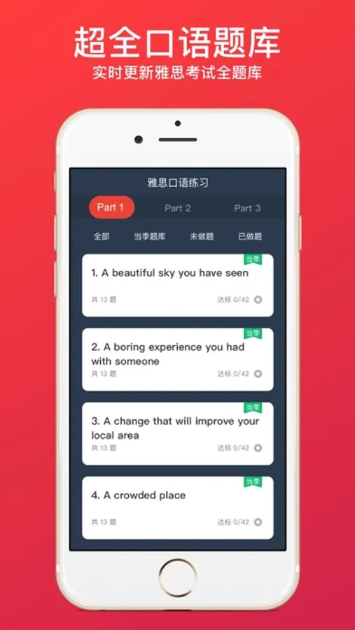 APP内置了目前超全的雅思口语考试话题库,实时更新。平常下功夫练习,考试时发挥更游刃有余。