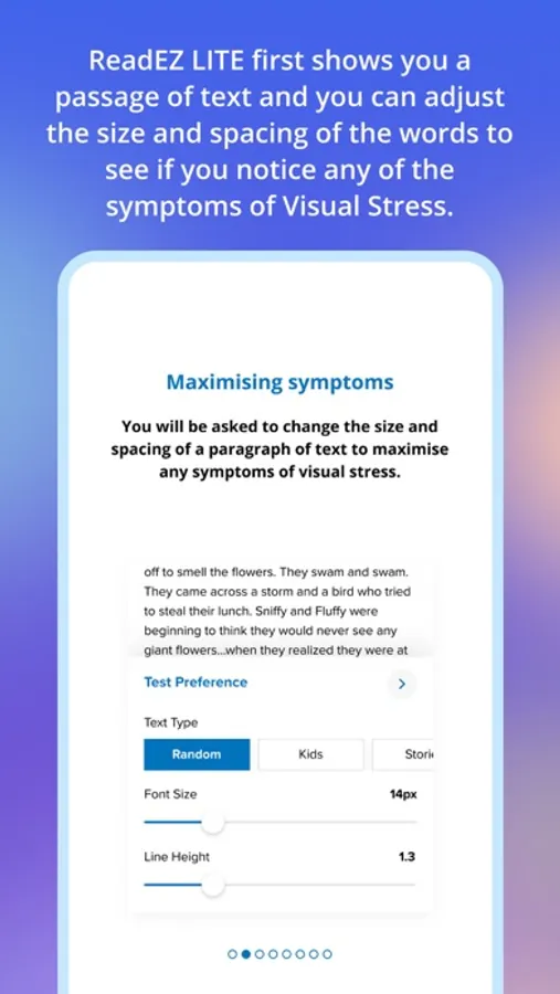 ReadEZ LITE first shows you a passage of text and you can adjust the size and spacing of the words to see if you notice any of the symptoms of Visual Stress.