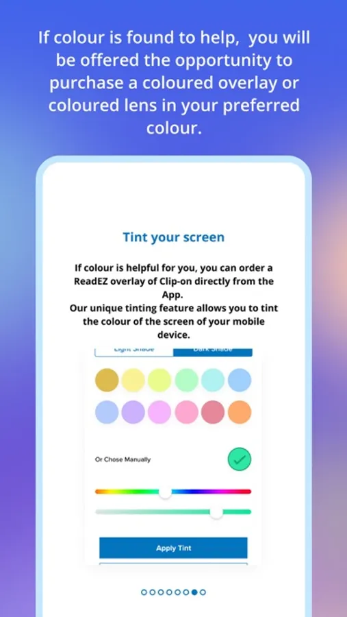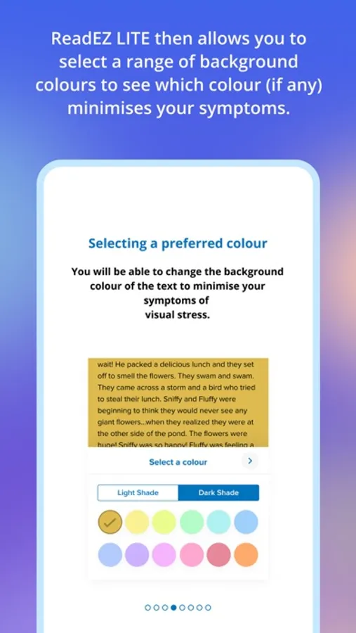 The ReadEZ system was originally developed by vision scientists at City University London and consists of a range of software to diagnose the condition and various solutions to help relieve the symptoms. ReadEZ LITE is a free app designed to help you determine if you suffer from Visual Stress and if so, which colour is most effective in terms of reducing the symptoms.