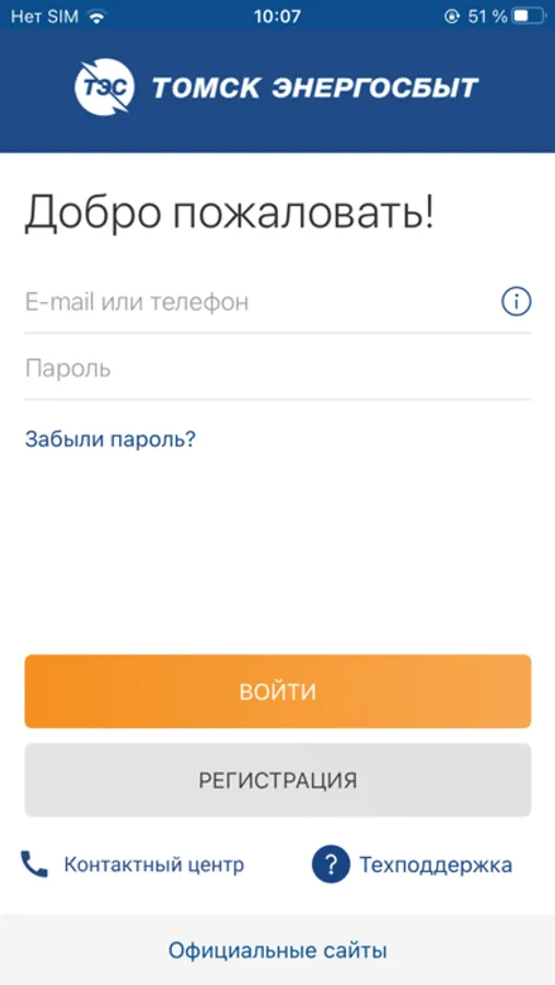 Если Вы зарегистрированы в Личном кабинете клиента АО «Томскэнергосбыт» и АО «ТомскРТС» на сайте https://my.tomskenergosbyt.ru/auth, для входа в приложение Вам достаточно использовать указанный Вами при регистрации телефон или e-mail и пароль.
