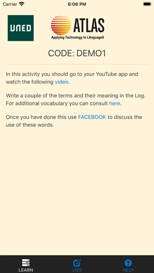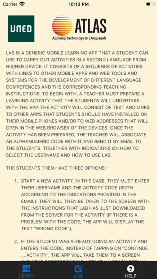 LAB is a second language learning app that can be used to undertake activities defined by a teacher. It has two parts, an activity screen that shows what a student must do, access web pages, use other apps, and a log, where notes can be taken.