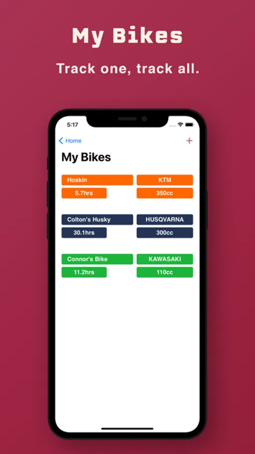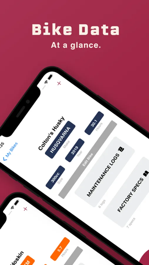 MY BIKES. Think of this as your garage - all the bikes you own, in one place. Tap on specific bikes to drill into the data behind a specific bike. For each bike, users can add specific details about your bike's identity, such as when you received it, who from, & at what hour you began tracking the maintenance.