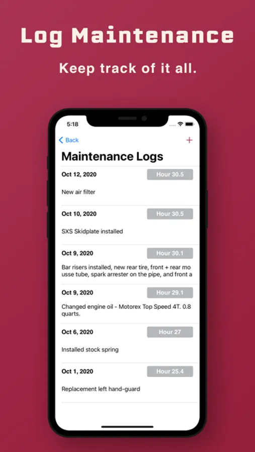 MAINTENANCE LOGS. This allows you to keep an organized record of everything you've ever done to your bike! Changed air filters, changed engine oils, installed add-ons, & anything else can all be recorded for accessing later! Every log has a notes section, to add notes & details about that specific log. Attached to each log is a record of what hour your bike was at, when that maintenance was performed, & on the date that maintenance was recorded.