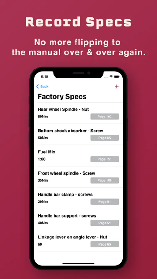 FACTORY SPECS. We all know the feeling of flipping to & from the manual like a mad-men when you're trying to put parts of your bike together. With the Factory Specs section, you can record your frequently accessed specs, so you can get to them at a glance.