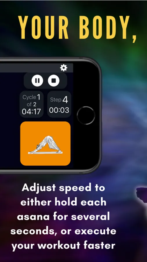 SUN SALUTATIONS COUNTING, ADJUST SPEED: Adjust the timing of every step. You can decide to either hold each asana for several seconds, or you can set the timer to execute your workout faster, which is ideal for weight loss. Make it fast or slow by adjusting the hold position time from 1 second to 3 minutes.