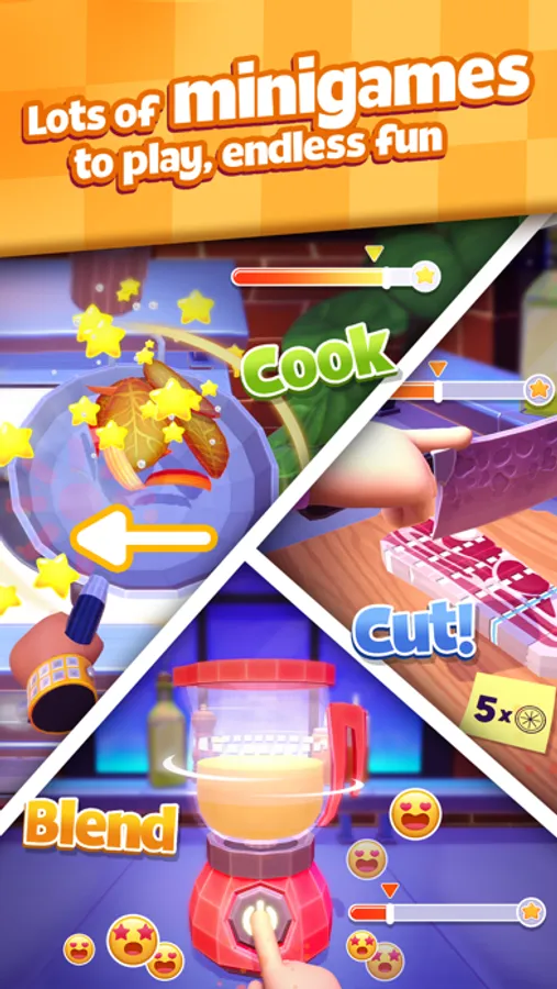 Play countless mini-games with a twist! Challenges will take you to cook recipes with extra added difficulty. Will you be able to clear all of them?