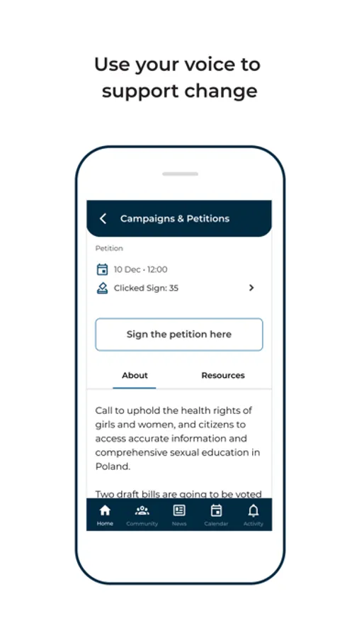 Sign time-sensitive petitions defending human rights and draw on our campaign materials to use your platform to advocate for equal opportunities.”