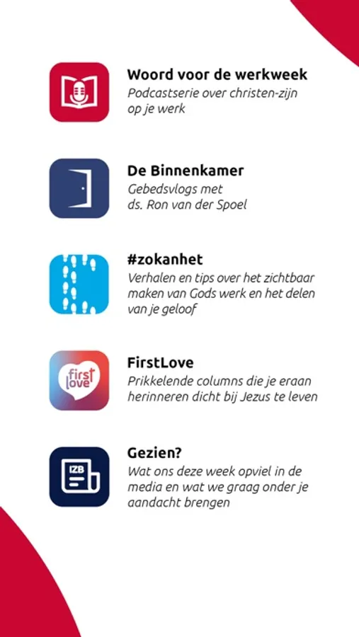 Deze app wordt gemaakt door de missionaire organisatie IZB. Je zou ons kunnen kennen van Eerst Dit, de dagelijkse Bijbelpodcast. Of van IZB-Focus, toerustingsprogramma’s voor kerken. Of van Areopagus, de ondersteuning van predikanten. Of van Dabar, het missionaire werk op campings. Aangenaam kennis te maken: www.izb.nl.