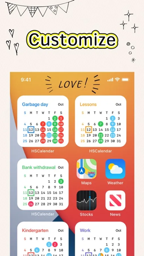 This app lets you place a monthly calendar on your home screen using iOS14's widget function. Unlike traditional wallpaper apps, you can freely place a mini-calendar on your home screen like you would an app icon. Just mark the dates with any color you like to quickly note down the days you want to remember. Skip the hassle of launching the app!