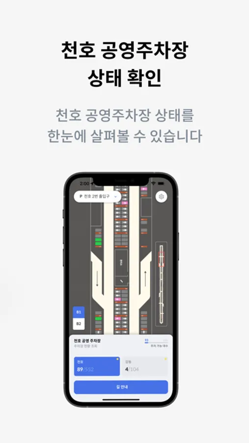 - 주차장이 얼마나 붐비는지 미리 걱정할 필요 없어요. 주차장의 상태를 한눈에 확인할 수 있습니다.