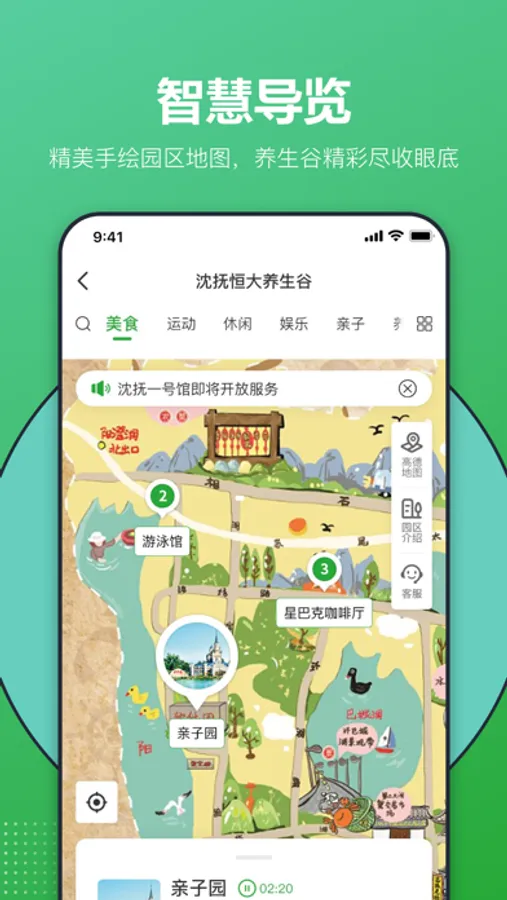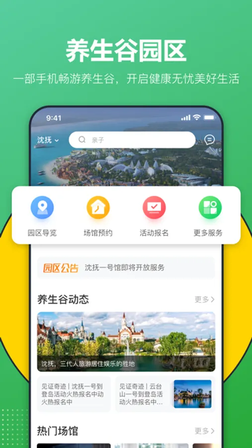 “恒大养生谷”APP是恒大集团为养生谷量身打造的一站式健康生活服务应用,旨在提供简单、方便、快捷的用户服务体验。提供园区导览、场馆预订、服务预约、活动报名、健康管理等功能,开启您的健康无忧美好生活,是玩转养生谷的必备神器。