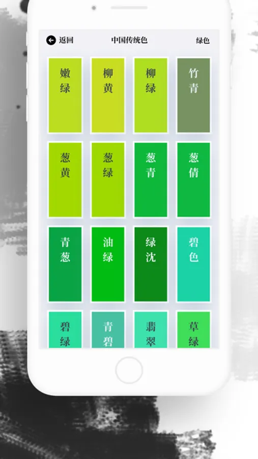 嫩绿、柳黄、柳绿、竹青、葱黄、葱绿、葱青、葱倩、青葱、油绿、绿沈、碧色、碧绿、青碧、翡翠色、草绿、青色、青翠、青白、鸭卵青、蟹壳青、鸦青、绿色、豆绿、豆青、石青、玉色、缥、艾绿、松柏绿、松花绿、松花色