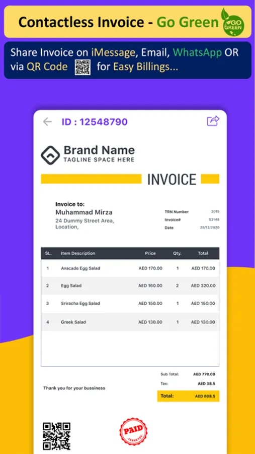 -Share invoice on iMessage, Email, WhatsApp or QR Code