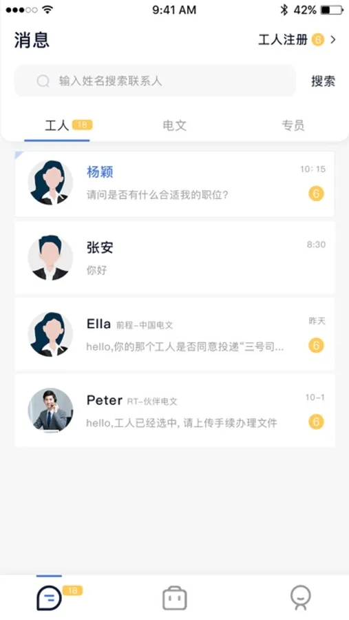 GS ERP主要分为业务(自营业务、外包业务)、电文(自营电文、伙伴电文)两个角色,使用账号登录后,判断角色,确定APP的内容。业务角色的功能主要包括:聊天、查看求职者注册的消息、查看职位列表及职位详情等;电文角色的功能主要包括:聊天、查看职位列表及职位详情,使用职位匹配求职者、进行邀约,查看人才库的求职者,通过求职者匹配合适的职位进行邀约,查看邀约、投递记录及投递详情等。