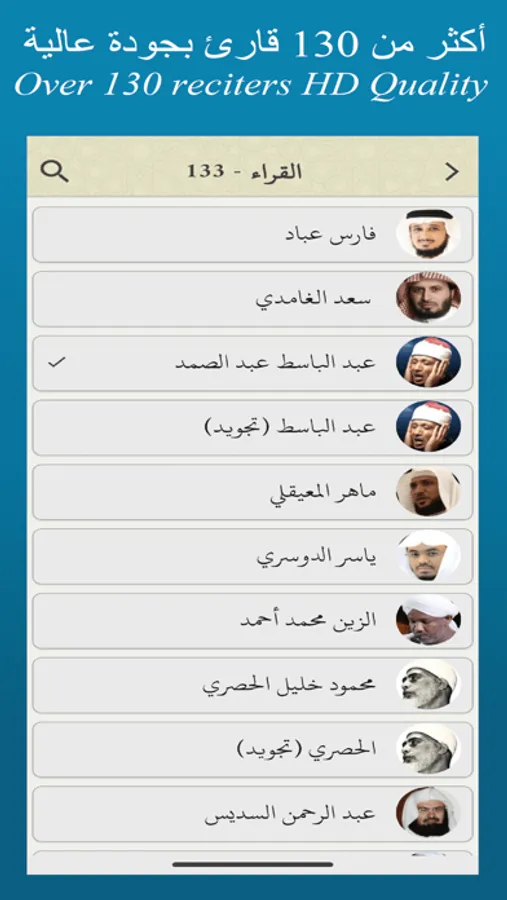 Faris Abbad, Saad Al-Ghamdi, Abdelbasit Abdelsamud, Mahir Al-Mughly, Yassir Al-Dosari, Al-Zain Mohammed Ahmed, Mahmoud Khalel Al-Hosari, Abdelrhamn Al-Sudais, Mishary Al-Afasi, Al-Fateh Al-zubair, Abdallah Khayat, Mohammad Al-Minshawi, Abdul Aziz Al-Ahmad, Abdulaziz Az-Zahrani, Abdulbari Mohammad, Abdullah Al-Mousa, Abdullah Qaulan, Abdulmohsin Al-Qasim, Abdulrahman Al-Majed, Abdulrasheed Soufi, Abdulwadood Haneef, Addokali Al-Alim, Adel Al-Khalbany, Nasser Al-Qatami, Menshawi tajwid, Nathier Al-Malki, Neamah Al-Hassan, Noreen Mohammad Siddiq, Omar Al-Qazabri, Abdelbaset abdssamad (Tajweed), And more..