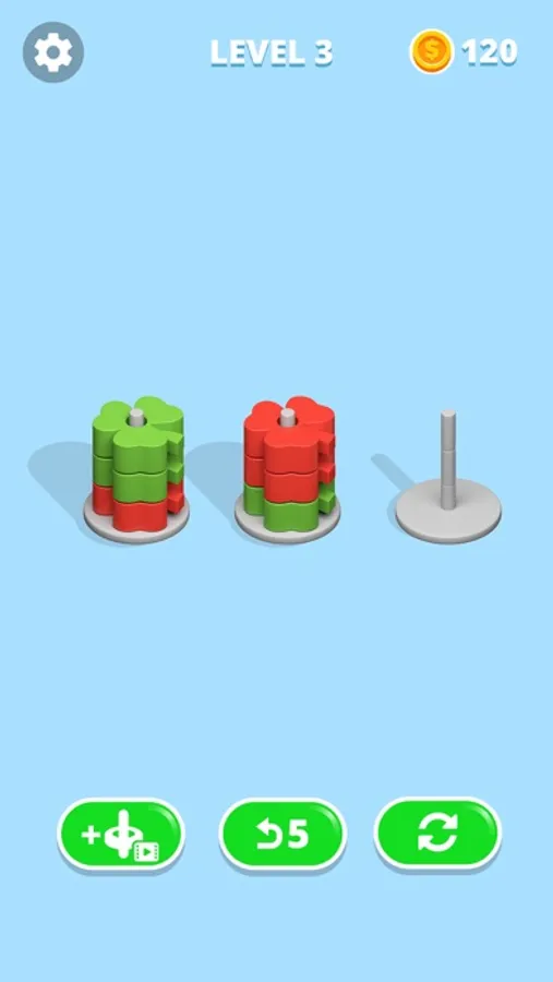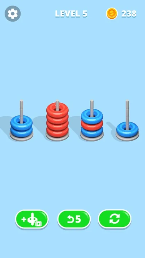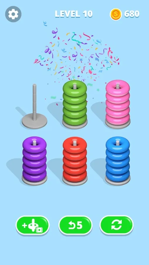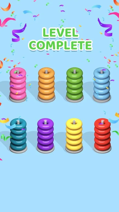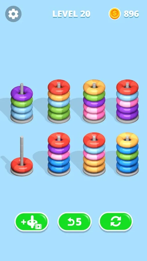 Solve the game by sorting colorful hoops. The only rule is that you can only move a hoop on top of another one if both of them have the same color and the hoop stack you want to move into still has enough space.
