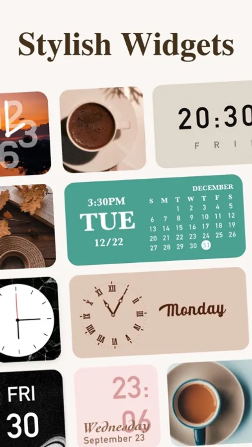 Analog clock, date, calendar, photo widgets with frames, day counter, and countdown. All the widgets are customizable with fonts and colors to fine-tune them in line with your preference.