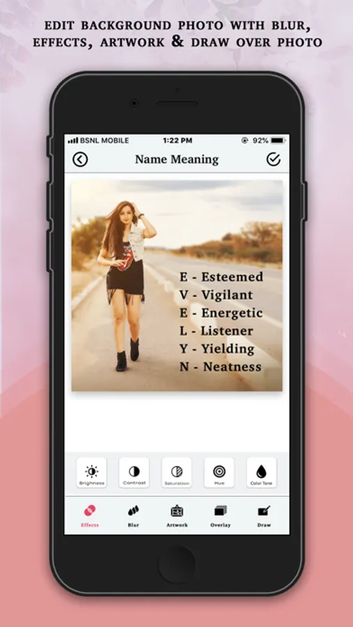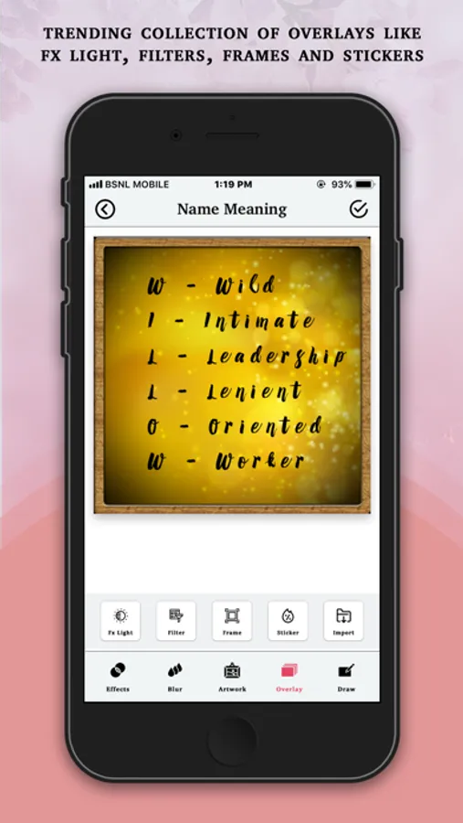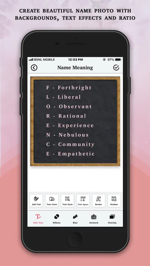 This app helps you to create beautiful name photo with different background images, text editing features, photo effects, artwork and overlays.