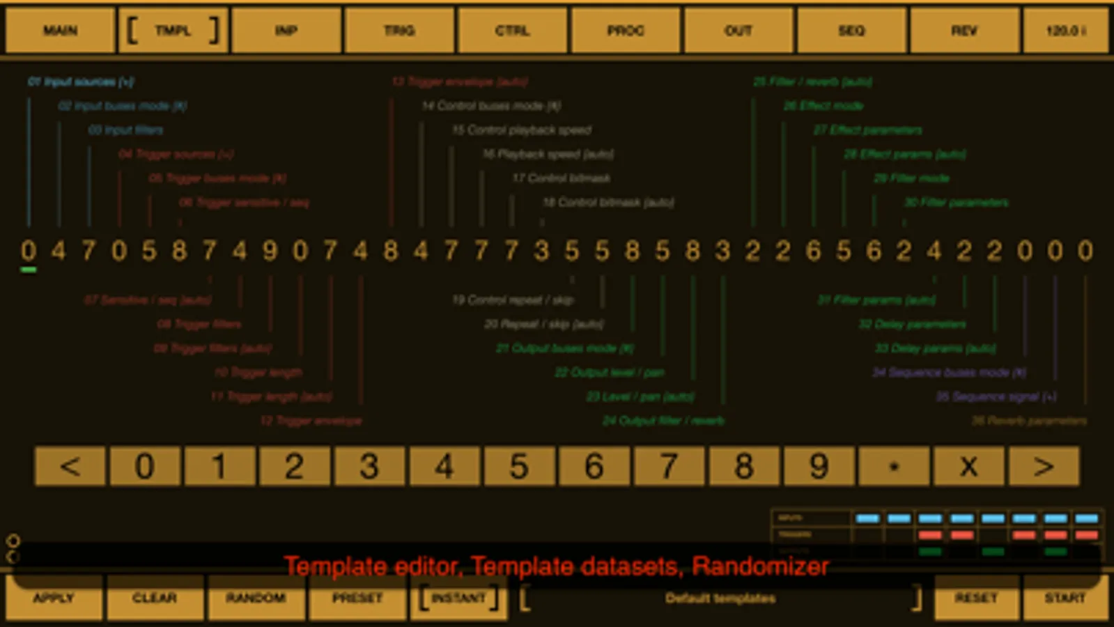 Please note that BeatCutter does not contain exact presets for a specific result. It has a large set of parameters that are adjusted by experiment depending on the source material. But for a quick start and search for ideas, this application has a convenient template editor, which consists of a set of numbers, where each number defines values for a group of parameters. You can change numbers in the template and listen to the result, or use the randomizer for the entire template, then change some specific parameters and save the current state as a preset.