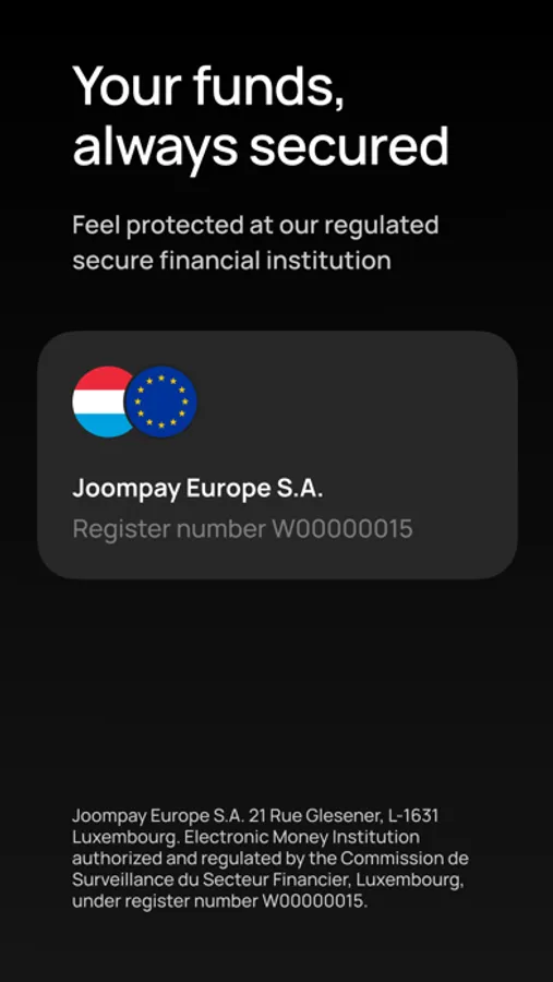 Joompay Europe S.A. 21 Rue Glesener, L-1631 Luxembourg. Electronic Money Institution authorized and regulated by the Commission de Surveillance du Secteur Financier, Luxembourg, under register number W00000015.
