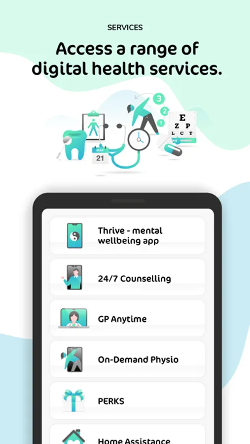 Download the app to access the Dashboard, Your Services, Healthy Bites and PERKS.