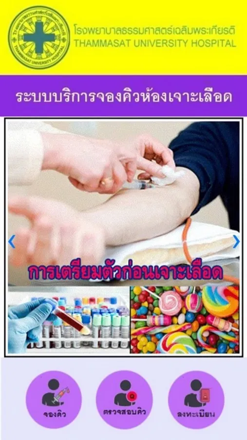 1.ผู้รับบริการสามารถจองคิวเจาะเลือดได้ และตรวจสอบสถานะของคิวเจาะเลือดได้